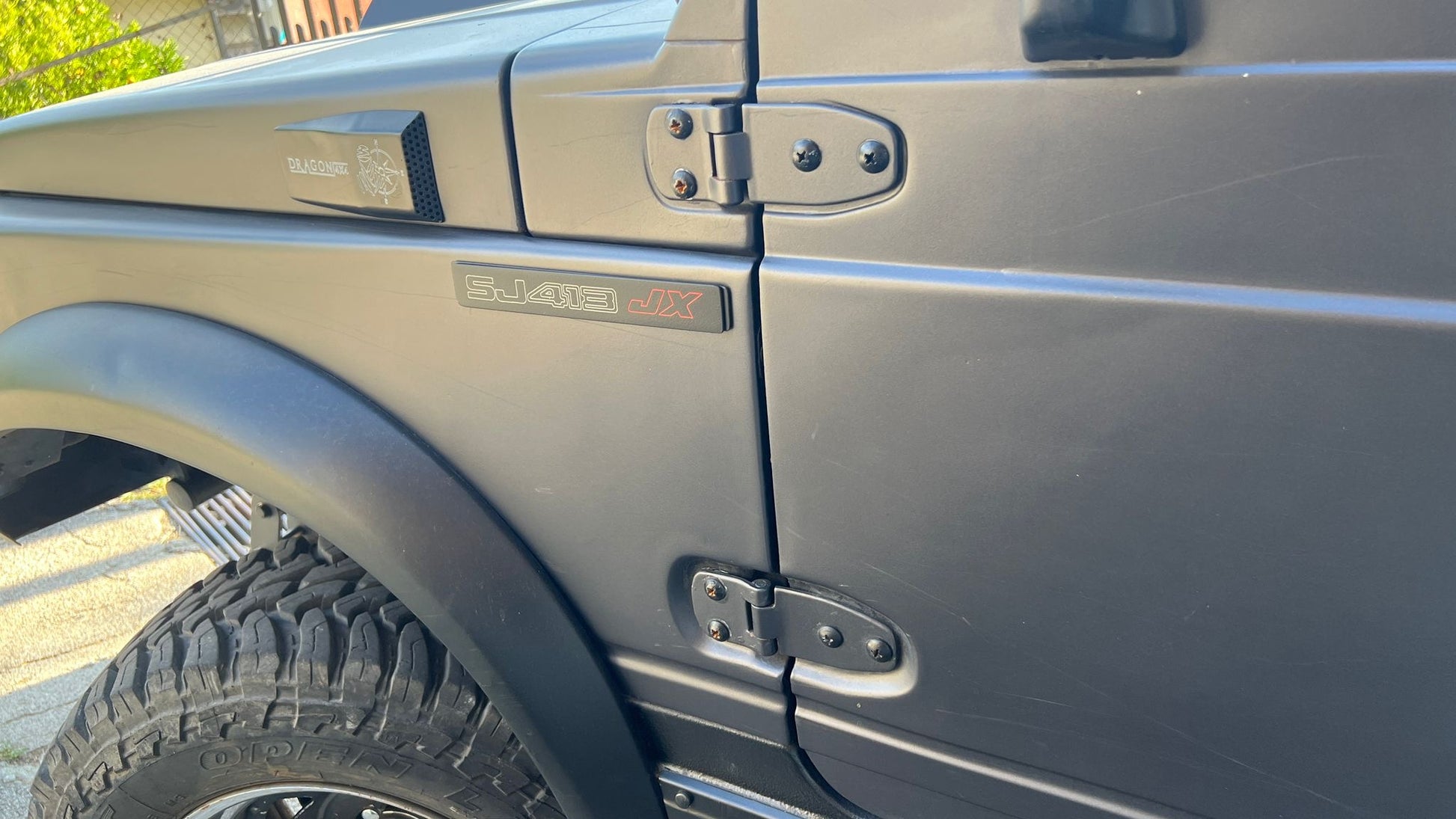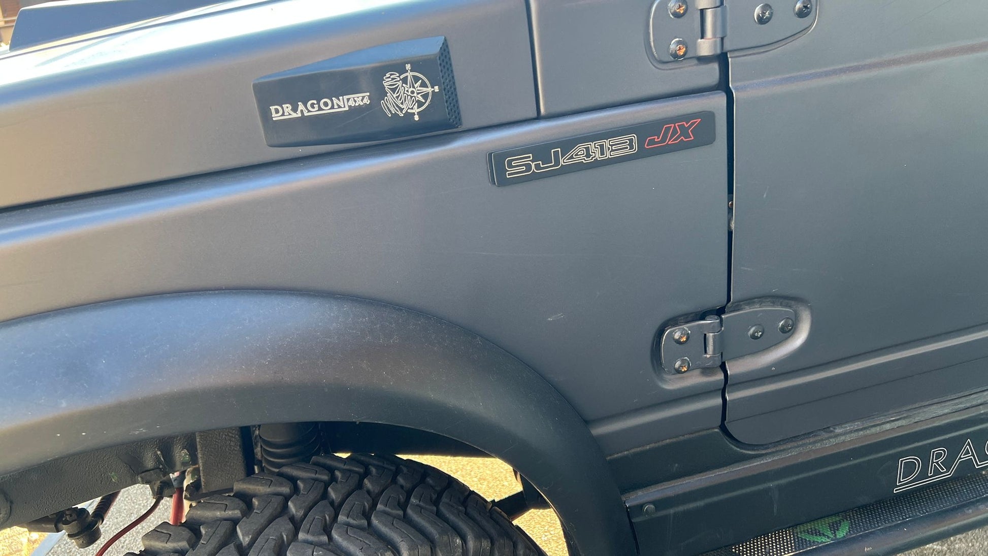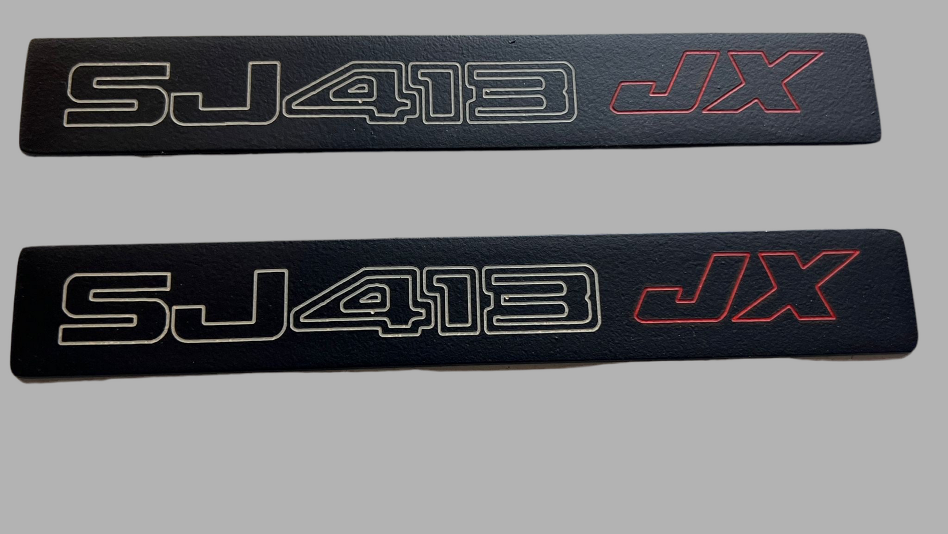 COPPIA DI EMBLEMI LATERALI PER SJ 413 JX PRODOTTE IN ALLUMINIO CON FINITURA NERO SATINATO E STRATO DI TRASPARENTE OPACO