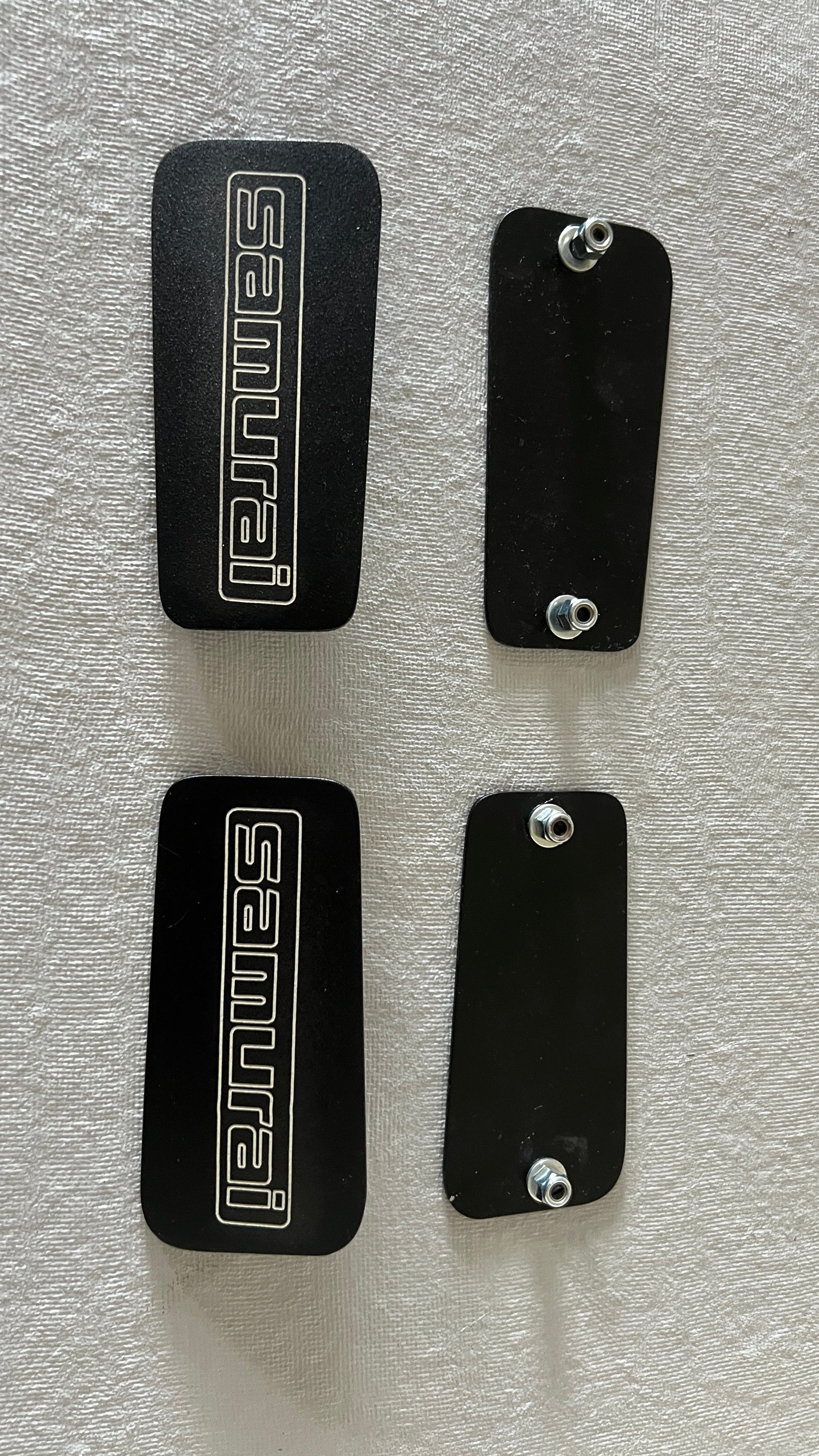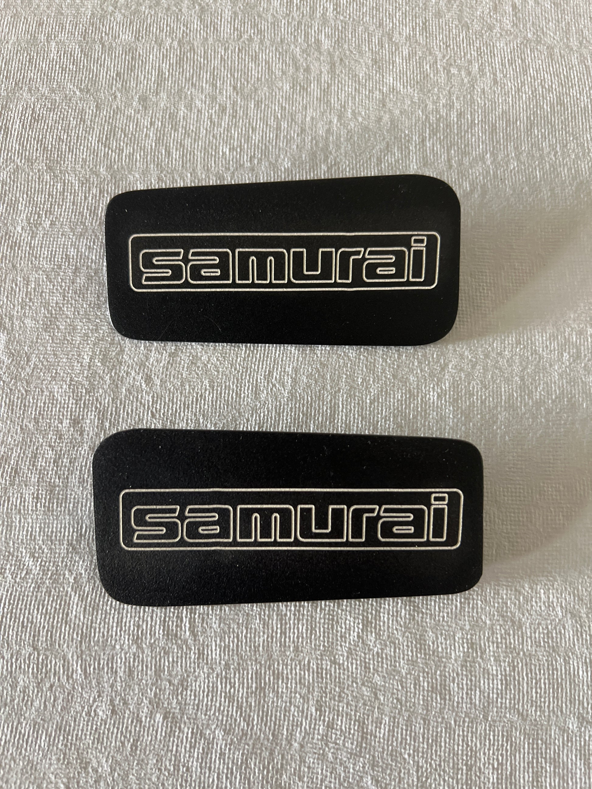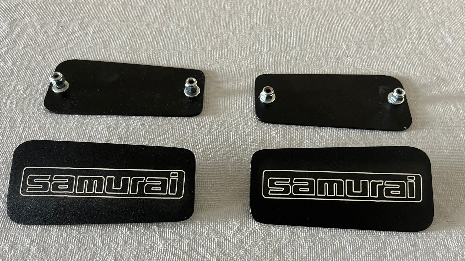 COPPIA Loghi SAMURAI per alloggiamento nei parafanghi anteriori montano tramite dadi M5 realizzati in metallo zincato verniciati con fondo e finitura Neto satinato con incisione laser