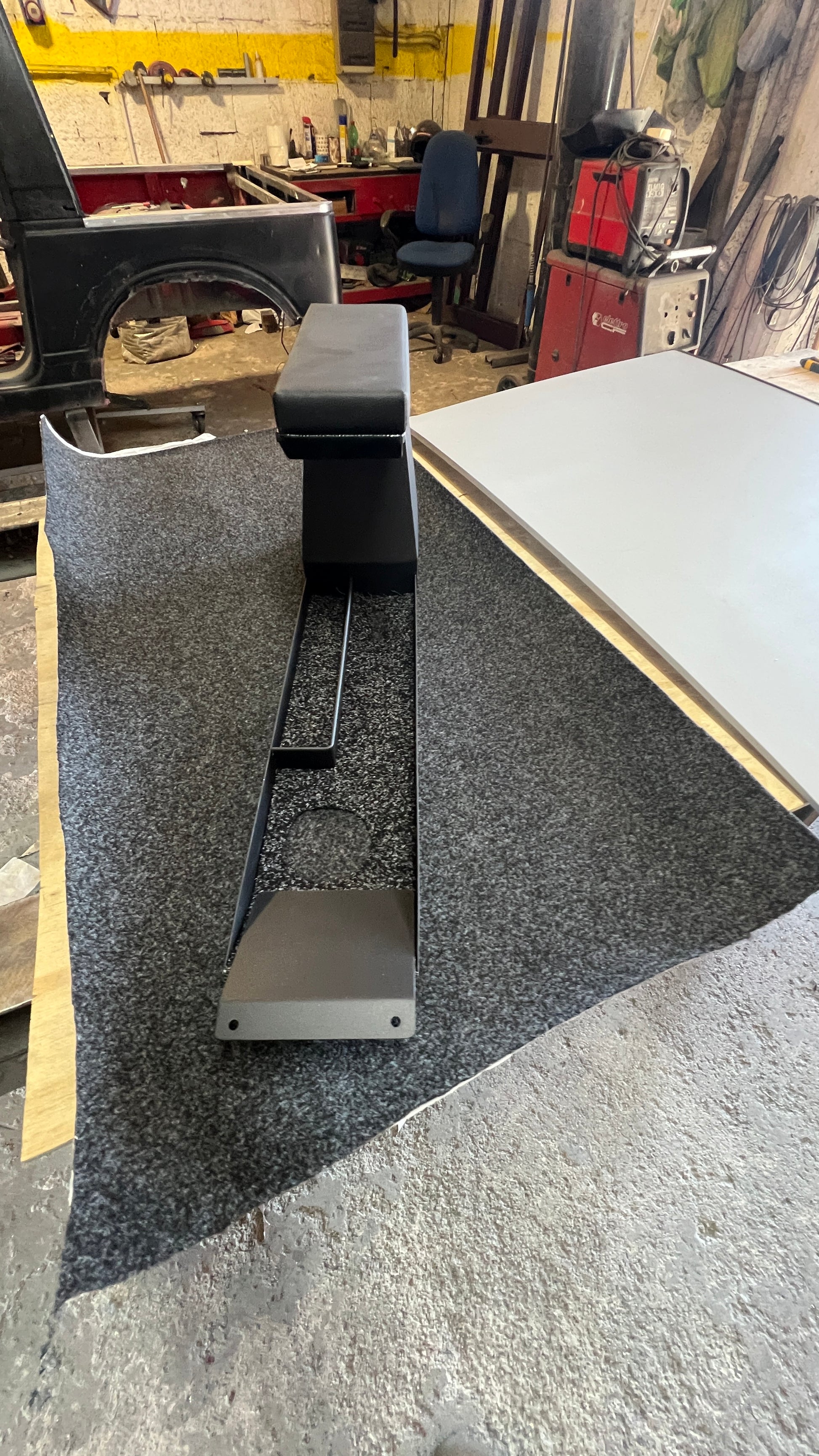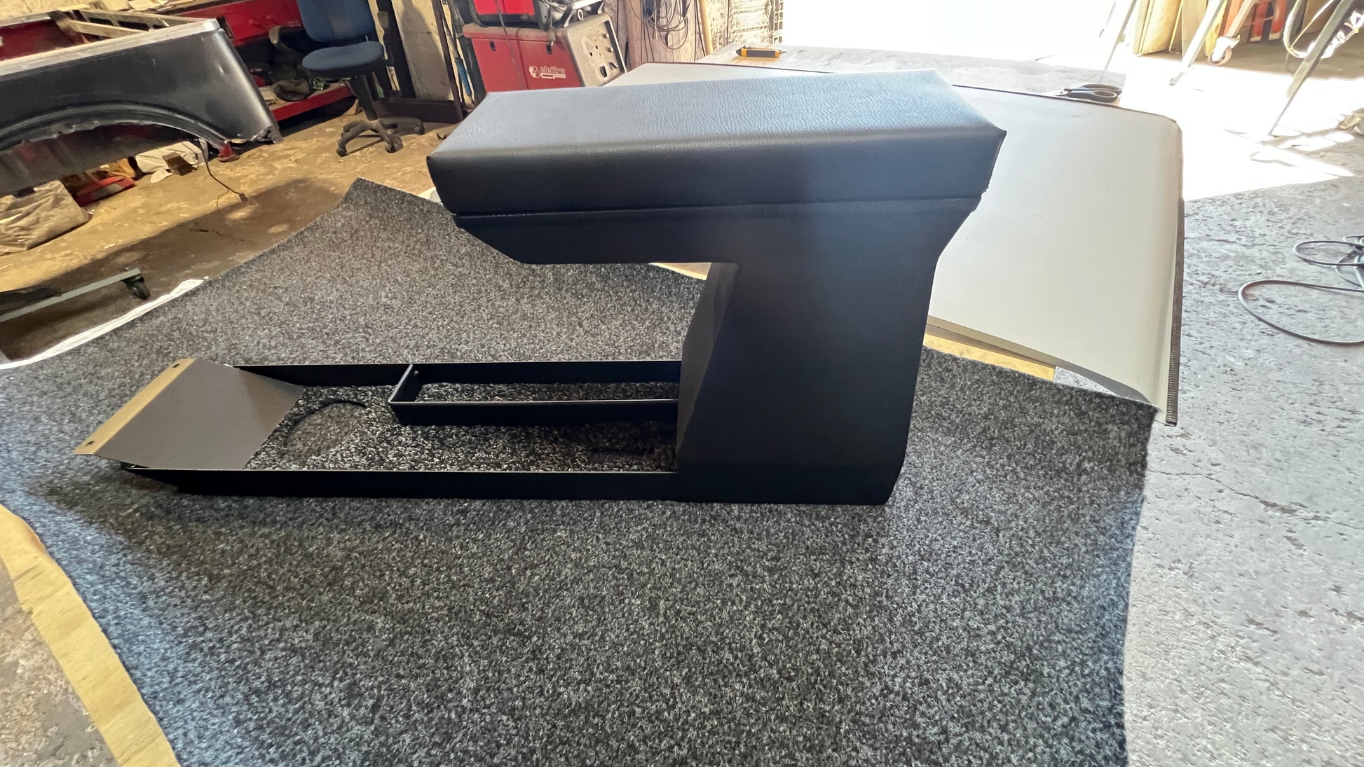 TUNNEL CENTRALE PORTAOGGETTI CON BRACCIOLO E TARGA INDICATIVA MARCE. IL PRODOTTO E' REALIZZATO IN LAMIERA ZINCATA E IL BRACCIOLO RIVESTITO IN PELLE NERA. IL TUNNEL E' PREDISPOSTO CON LE ASOLE PER LEVA RIDUTTORE E FRENO A MANO.